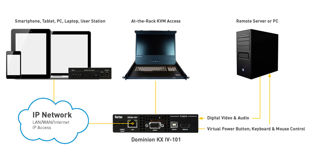 The Dominion® KX IV-101 (DKX4-101), Raritan’s highest performing KVM-over-IP switch, provides a new level of Ultra HD 4K performance for remote access and management. More powerful and flexible than any other KVM-over-IP solution, it supports higher video resolutions, faster frame rates, higher video quality, and substantially faster virtual media. Manage up to 8 serial devices with optional DSAM modules. New fanless operation with no moving parts — silent operation with enhanced reliability and longer life. The KX IV-101 supports unblocked, Java-free, BIOS-level remote access of a single server, PC or workstation over LAN, WAN or even the Internet. A native HDMI device, the KX IV-101 has available cables/adapters for VGA, DVI, Mini DisplayPort, and USB-C. It provides users the most flexibility with access remote computers via User Station, laptop, PC or smartphone. The KX IV-101 supports many of the popular Dominion features such as virtual media, absolute mouse synchronization, LDAP/Radius/AD authentication, AES encryption, support for up to 8 simultaneous sessions, and much, much more.