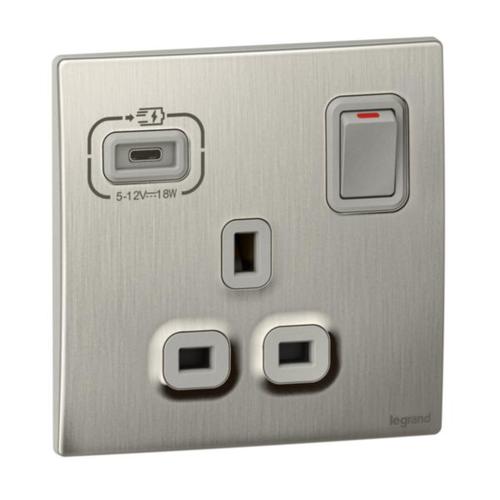 Mallia Senses - 1 gang single pole switched socket outlet - with USB C 18W charger - Brushed Aluminium