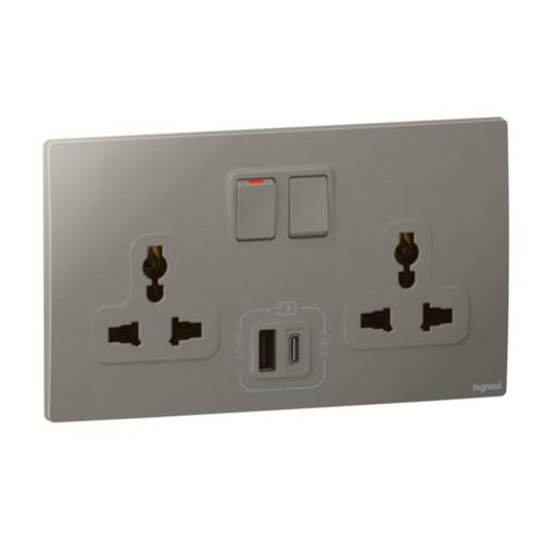 The double switched socket outlet allows to supply power to an electric or electronic device. The twin C and A Types USB chargers allow to conveniently charge electronic devices fast.