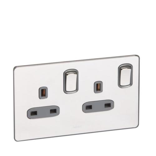 Synergy™ Sleek - 2 gang switched single pole BS socket outlet 13A - Polished Stainless Steel