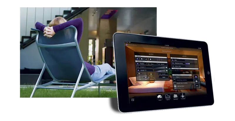 Using a home automation system, you can set ambient lighting moods, the right music and a trickling fountain, all at the touch of a button. Depending on the weather, you can even ensure automatic control of water sprinklers, pool cover and awnings.